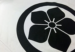 のれんの原稿を作成いたしました。サイズはW213cm×H140cm、防炎加工済みの葛城木綿生地を使用し、中央に家紋を黒で名入れします。3枚割れ、上部は袋縫いに仕立てます。